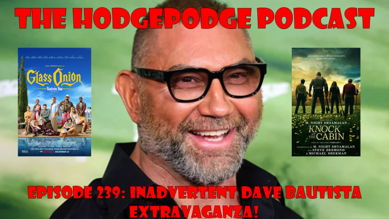 In Episode 239, Doug and Dirty A have an inadvertent Dave Bautista party as they discuss the films Glass Onion and Knock at the Cabin! Are these two winners or evidence that Bautista should go back to wrestling?